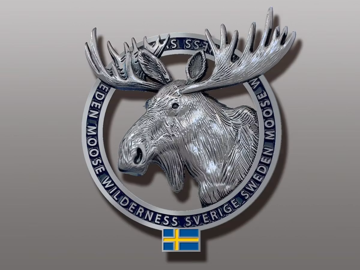 Metallmagnet mit detailliertem Elchmotiv und schwedischer Flagge
