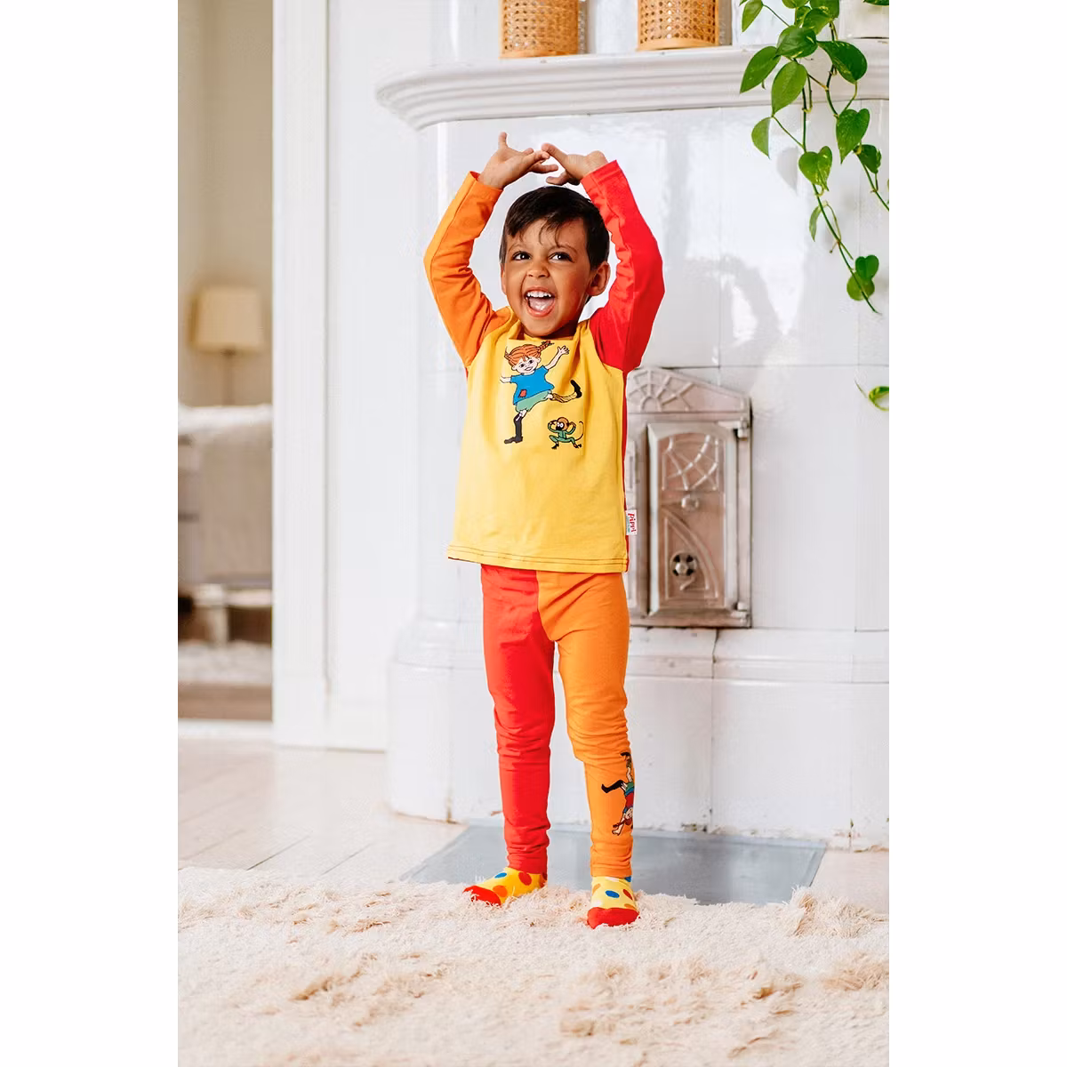 En långärmad, solgul trikåtröja i rak modell, med ärmarna roligt olikfärgade i orange och rött. Framtill har tröjan ett rubbertryck av den glada Pippi Långstrump tillsammans med Herr Nilsson.