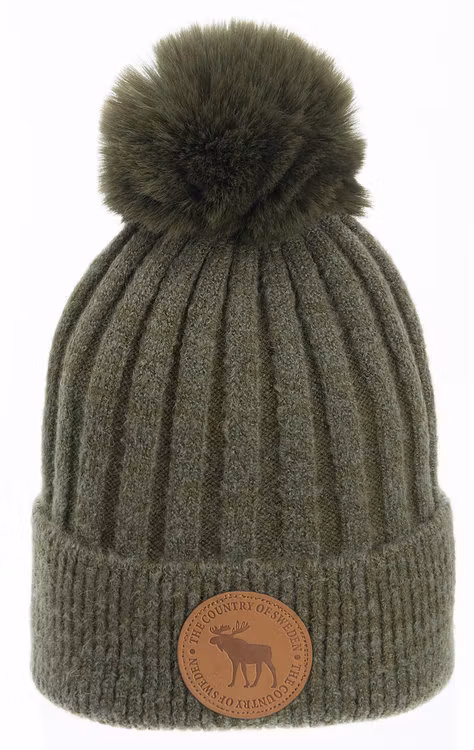 Grön vintermössa med lädermärke och pom – Robin Ruth