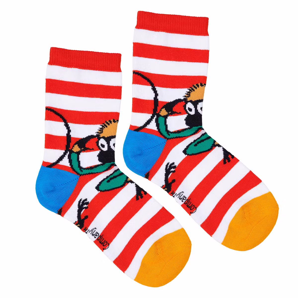 Glada Pippi Långstrump sockor för barn. Det ena paret blått med stort Pippitryck, gula tår och röda hälar, det andra paret rödvitrandigt med Herr Nilsson, orange tår och blå hälar. Tillverkade av elastisk bomullsblandning. Öko-tex.