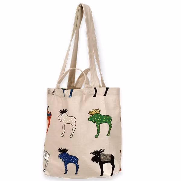 ENGLISH: A thick and strong cloth bag with moose motifs on both sides. Say goodbye to plastic bags and put your goodies in this 100% cotton and sturdy cloth bag. There is more than enough space for food, books, and more with just the right size for your everyday life, to take with you about everywhere.