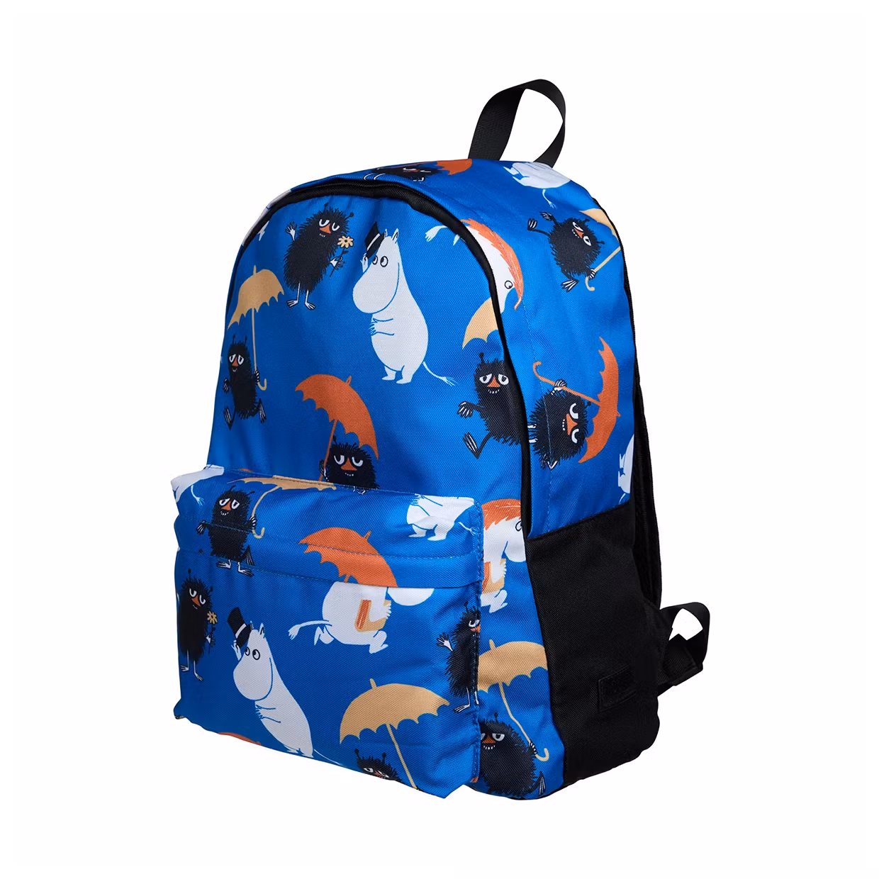Blå, liten Nipsu-ryggsäck har Drizzle-trycket. Denna hållbara, bekväma ryggsäck passar bra för barn som börjar skolan eller dagis, för studenter och för resor och resor.