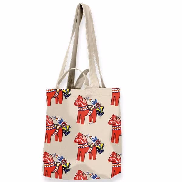 ENGLISH: A thick and strong cloth bag with Dalahorses motifs on both sides. Say goodbye to plastic bags and put your goodies in this 100% cotton and sturdy cloth bag. There is more than enough space for food, books, and more with just the right size for your everyday life, to take with you about everywhere.