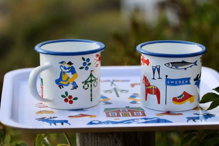En färgstark emaljmugg fylld med klassiska svenska symboler – midsommarstång, dalahäst, blåbär, kräftor, älg, röda stugor och små folkliga detaljer som gör motivet levande och lekfullt. Designen löper runt hela muggen och skapar en hel liten värld av svensk kultur i miniformat.