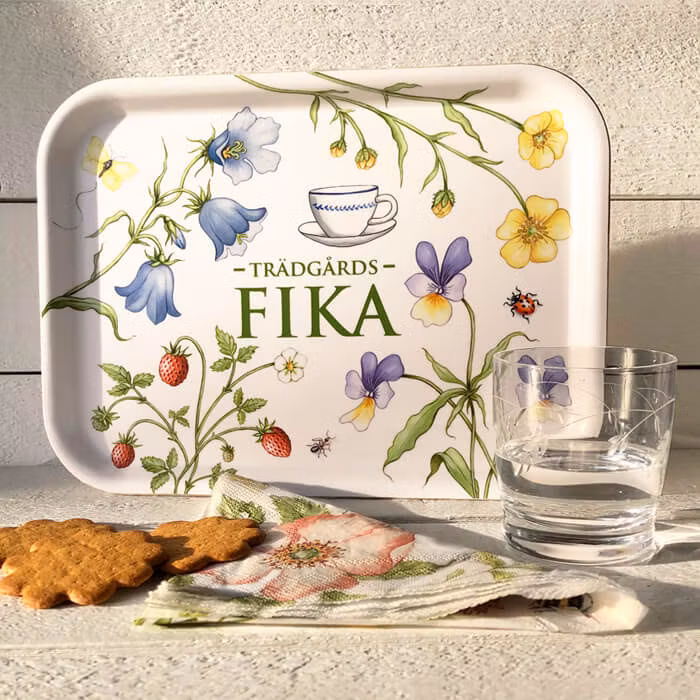 Bricka med vackert motiv av blommor, jordgubbar och texten "Trädgårds FIKA" och även en trevlig motiv på baksidan.