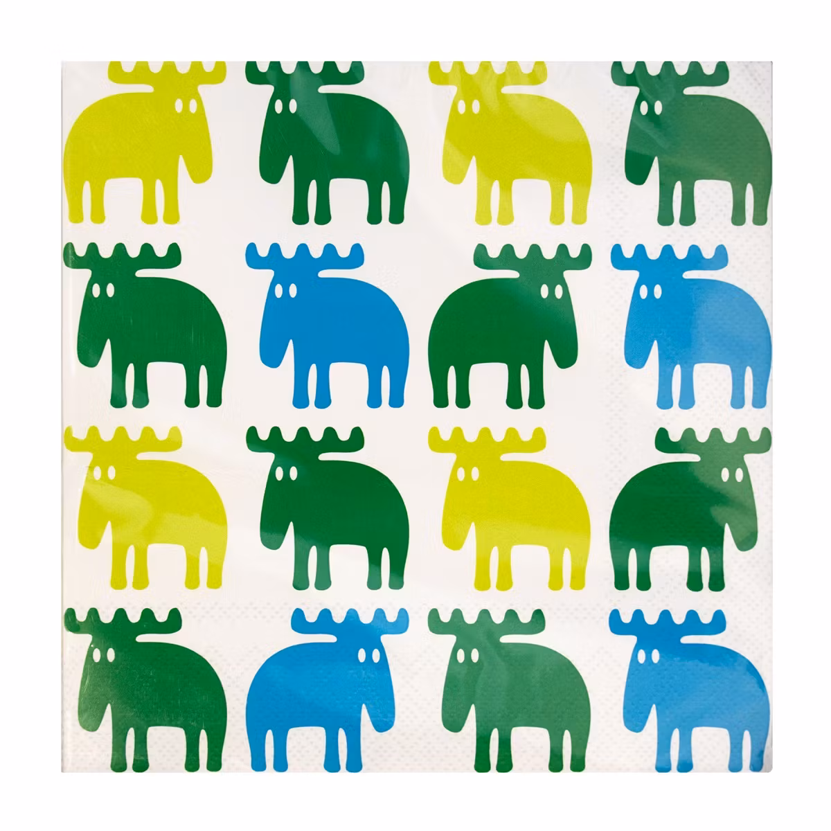 Lunchservett älg, grön & turkos 59 kr "Produkten är dessvärre tillfälligt slut i lager."“Unfortunately, the product is temporarily out of stock.”"Das Produkt ist leider vorübergehend nicht auf Lager.“ Artikelnummer: 2488 Dela Information Designer: Anders BylinStorlek: 33×33 cm 20-pack