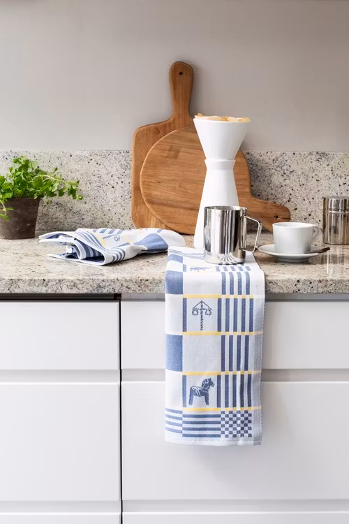 ENGLISH: Comfortable towels from Ekelunds with GOTS certification. Lovely motif with the highest quality at the Swedish-made Linen Weaving in Horred since 1692. Woven towel with various motifs in 100% organic cotton and fits both hands and dishes.