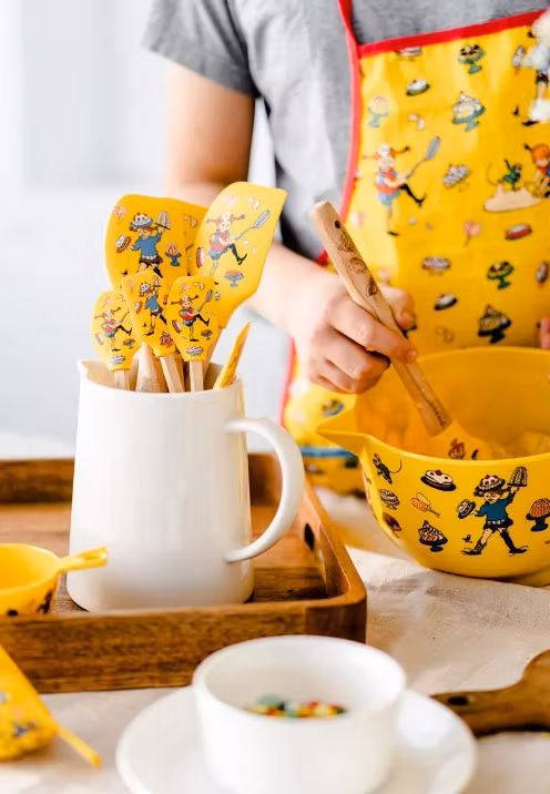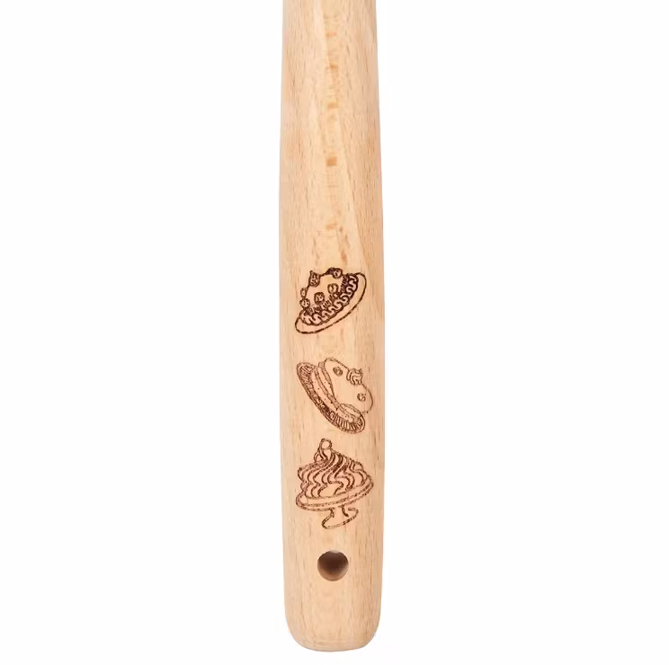 En slickepott med ett knallgult silikonblad och Pippi Långstrump bland tårtorna i färg på bägge sidor. Det runda skaftet är av trä och högst upp på skaftet finns det ett hål för upphängning på tunn krok. Träskaftet är dekorerat med tårtor i lasergravyr. Handdisk rekommenderas. Tål värme max 40°C.