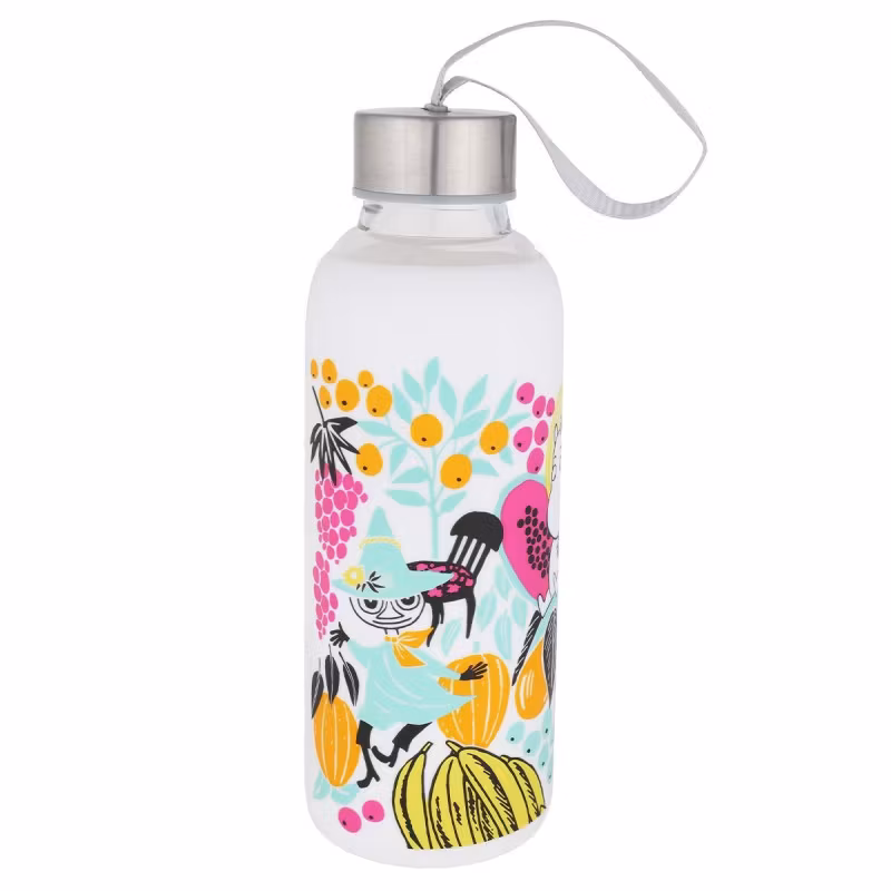 Dricksflaska tillverkad av glas och ett silikonöverdrag. Silikonhylsan är dekorerad av Papaya-trycket, där Lilla My, Moomin trollet, Sniff och Snusmumriken är omgivna av fräscha frukter och färger.