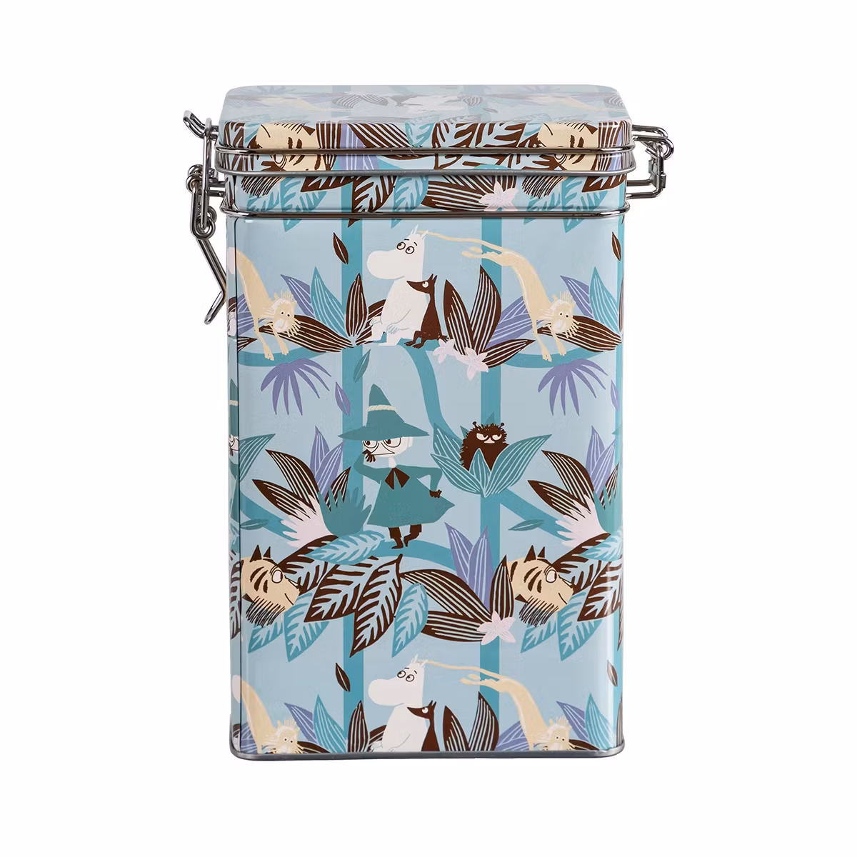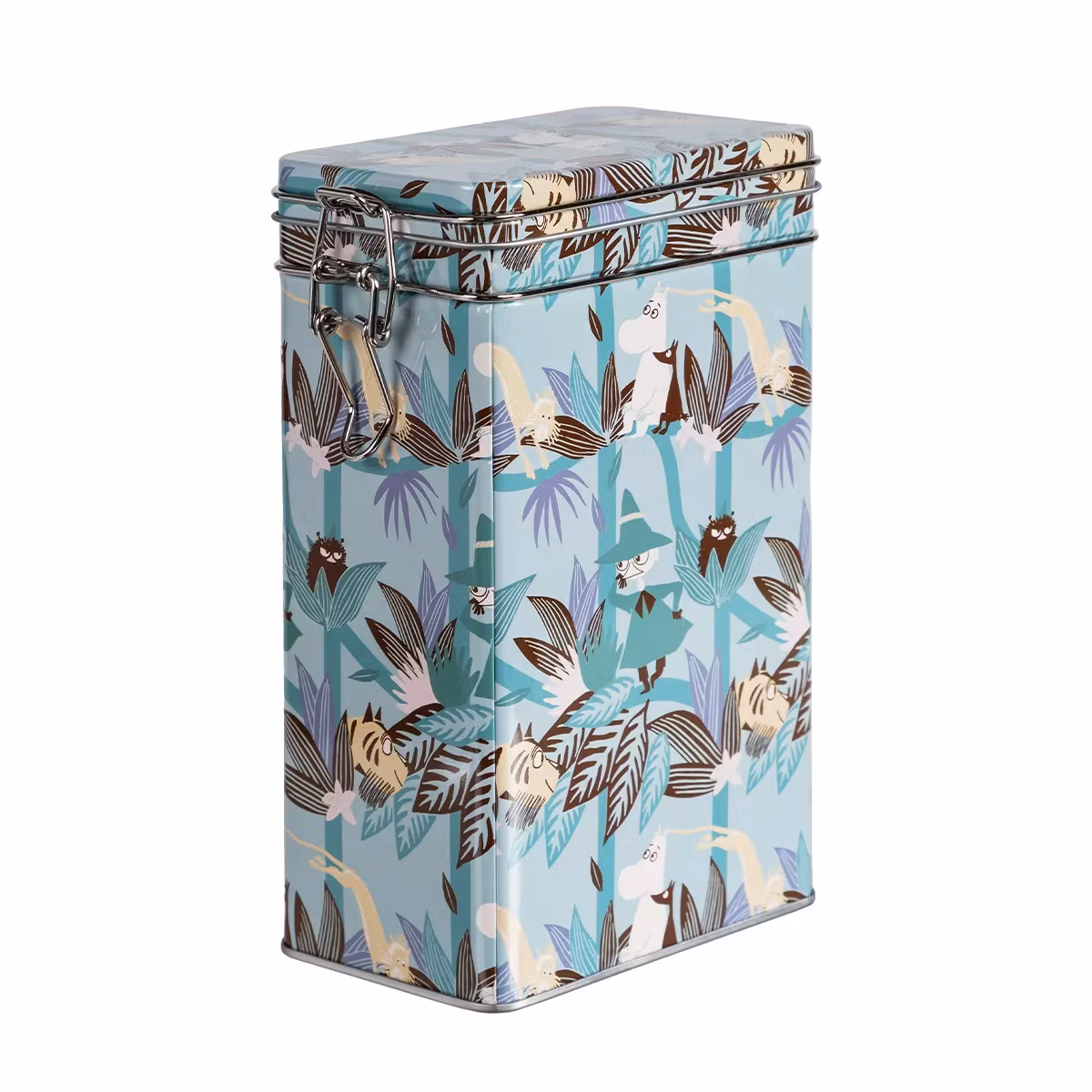 kaffeburk med ett tätt lock med spännlås. En kaffeburk som dekoreras av ett Moomin Trädkrona-motiv i blågröna nyanser. Välbekanta moominfigurer kikar fram bland trädtopparna i djungeln i detta motiv.