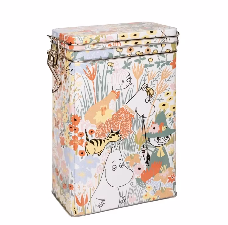 En vit kaffeburk som dekoreras av ett Moomin Smörblomma-motiv i härliga pastellnyanser, där välbekanta moomin figurer sitter på en äng bland färgglada blommor.
