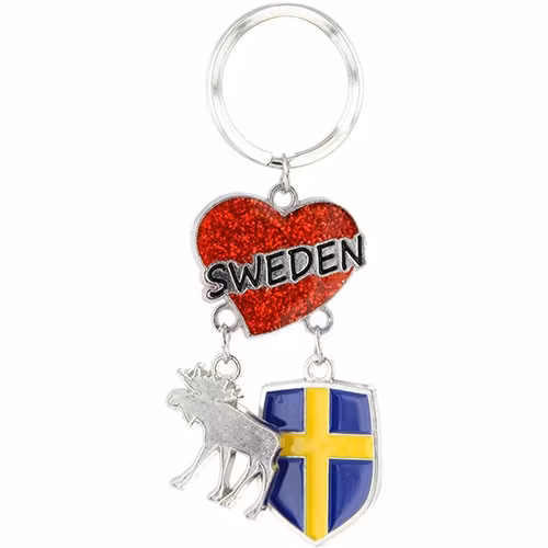 Nyckelring hjärta, Sweden, älg, sköld 55 kr "Produkten är dessvärre tillfälligt slut i lager."“Unfortunately, the product is temporarily out of stock.”"Das Produkt ist leider vorübergehend nicht auf Lager.“ Artikelnummer: 7331133250431 Dela Information Nyckelring i metall