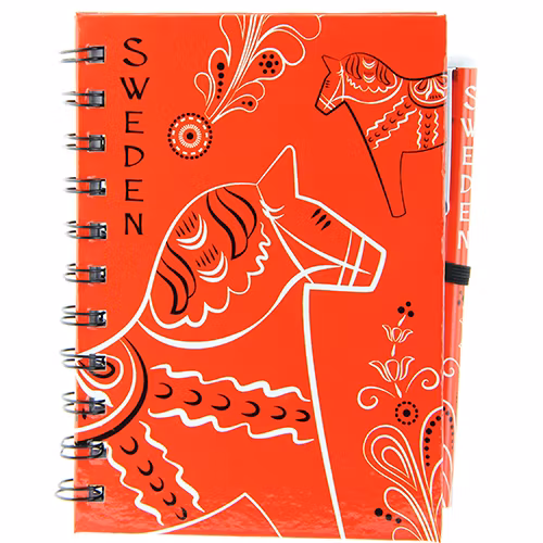 Fina dalahäst och kurbitsblom teckningar och text "Sweden" på både penna och bok.