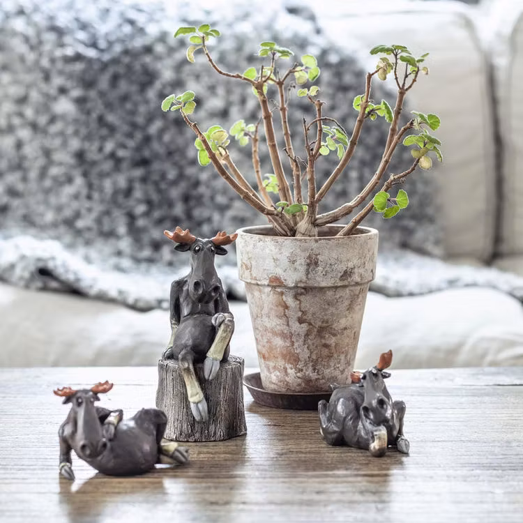 Roliga älg som frambringar ett leende. Med stark personlighet, lång nos och kutig rygg poserar älgarna nonchalant eftersom de själva utsett sig till skogens konung. Av Svensk designer Cecilia Carlsson. Nääsgränsgården