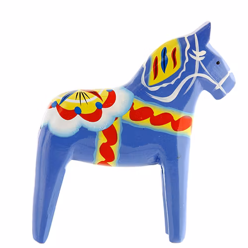 The Dala horse is 10cm in height, color blue. Material wood. Not hand painted. This is not from Sweden.