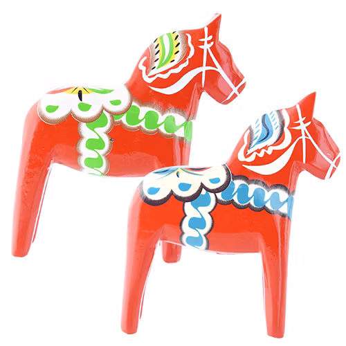 The Dala horse is a different in height, with the base color red and either blue or green in character. Material wood. Not hand painted.