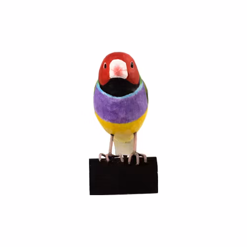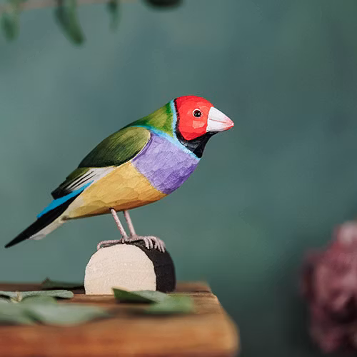 Gouldamadinen är svenskdesignad och tillverkad för hand i snidat trä och miljövänlig färg. Då fågeln är handgjord har var och en små, vackra detaljvariationer som ger personlighet till varje individ.