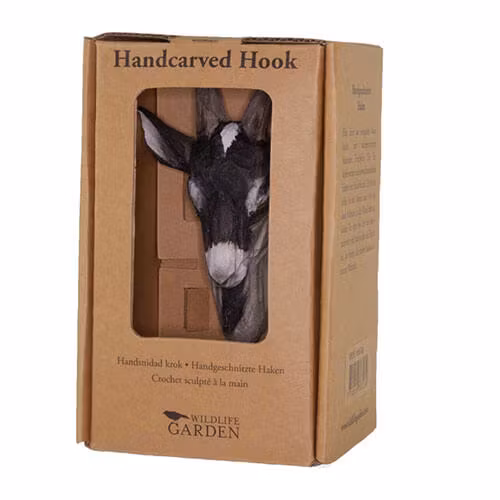 Denna klädhängare föreställer en busig get. Geten är ett akrobatiskt djur som är duktigt på att hoppa och klättra. Här är den naturtroget avbildad i trä med en rejäl krok i metall.