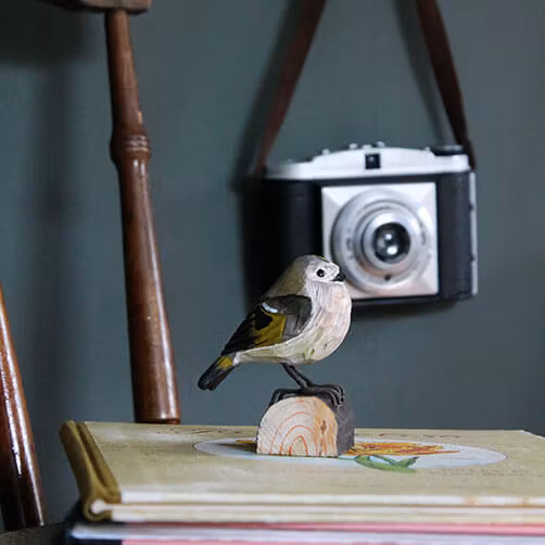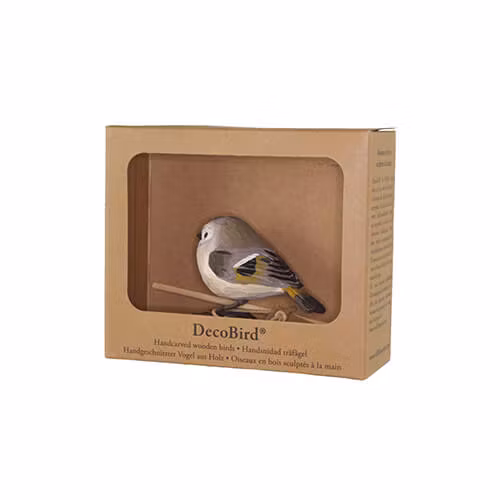 Detta är en naturtrogen avbild av fåglarnas minsting, kungsfågeln. Den klotrunda lilla fågeln utgör en näpen syn. Den kan vara svår att se då den mest tillbringar tiden uppe i grantopparna. Med en handsnidad och penselmålad DecoBird kungsfågel får du en naturtrogen avbild som kan betraktas varje dag!