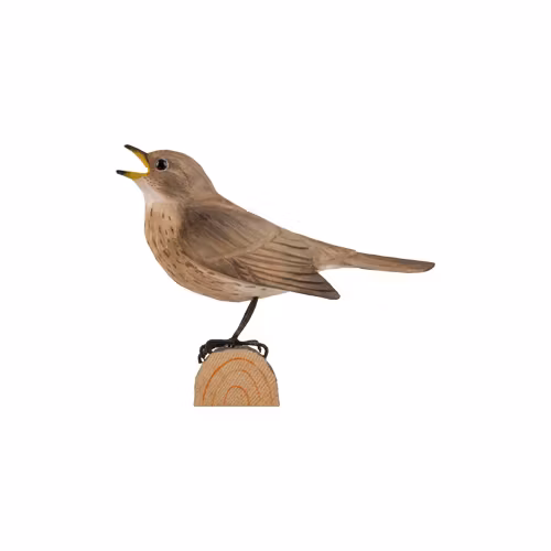 Näktergalen är snidad i lindträ och handmålad i miljövänlig färg och avbildad i en sjungande pose i naturlig storlek. Den kan bli ett vackert inslag i inredningen, och en unik och tidlös present till alla som gillar djur och natur.