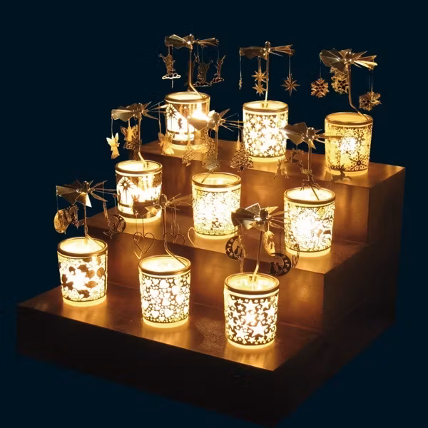 English: Änglaspel is a classic and elegant Änglaspel that gives the perfect atmosphere, for example at Christmas time when many have had a tradition of having an Änglaspel in front ever since these became popular around the world after the Second World War. The height of the angel glass is about 14 centimeters, and it is made of plated steel sheet of excellent quality and glass. A set of candles (five pieces) is included in the package as well as tealights. Angel games work in such a way that the heat from burning candles makes a turbine with angels spin.