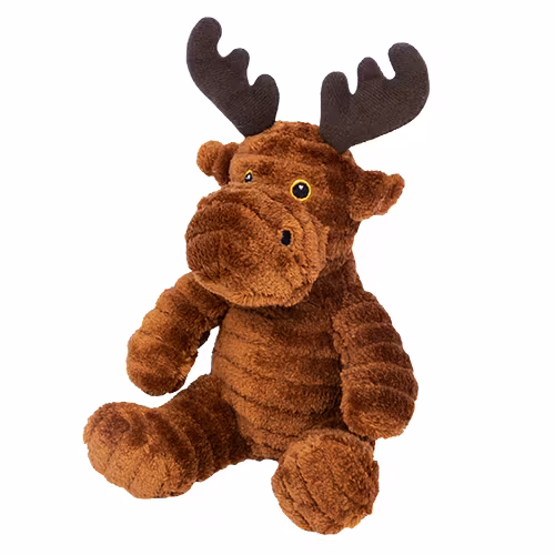 SE: Sittande gullig mjukis älg i brun teddyplysch. Klädd i fint stickad tröja. Svarta knappnålsögon och broderade näsborrar. Älgen har slappomaterial i bakdelen för att addera tyngd och kvalitetskänsla till produkten. Ca 14 cm hög.