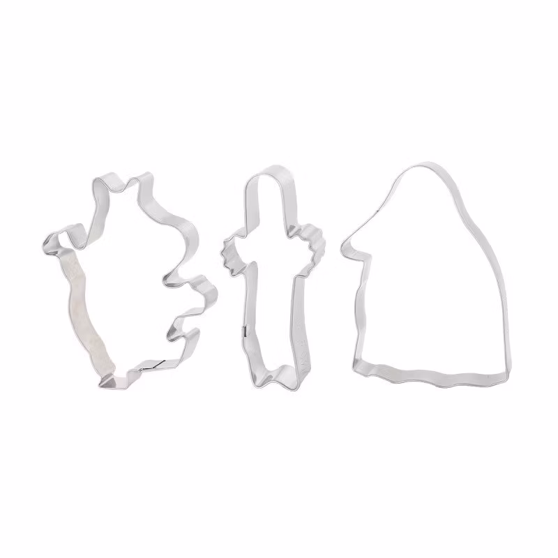 Ett set pepparkaksformar i rostfritt stål, formade som Mumintrollet, en Hattifnatt och Mårran. Perfekt som gåva!