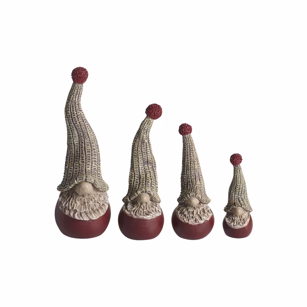 Ett set med tomtar i varierande storlek, där den höga, smala formen och de neddragna luvorna ger ett stillsamt och lite hemlighetsfullt uttryck. Ansiktena är enkla och dämpade, vilket gör att figurerna känns mer lugna än lekfulla.