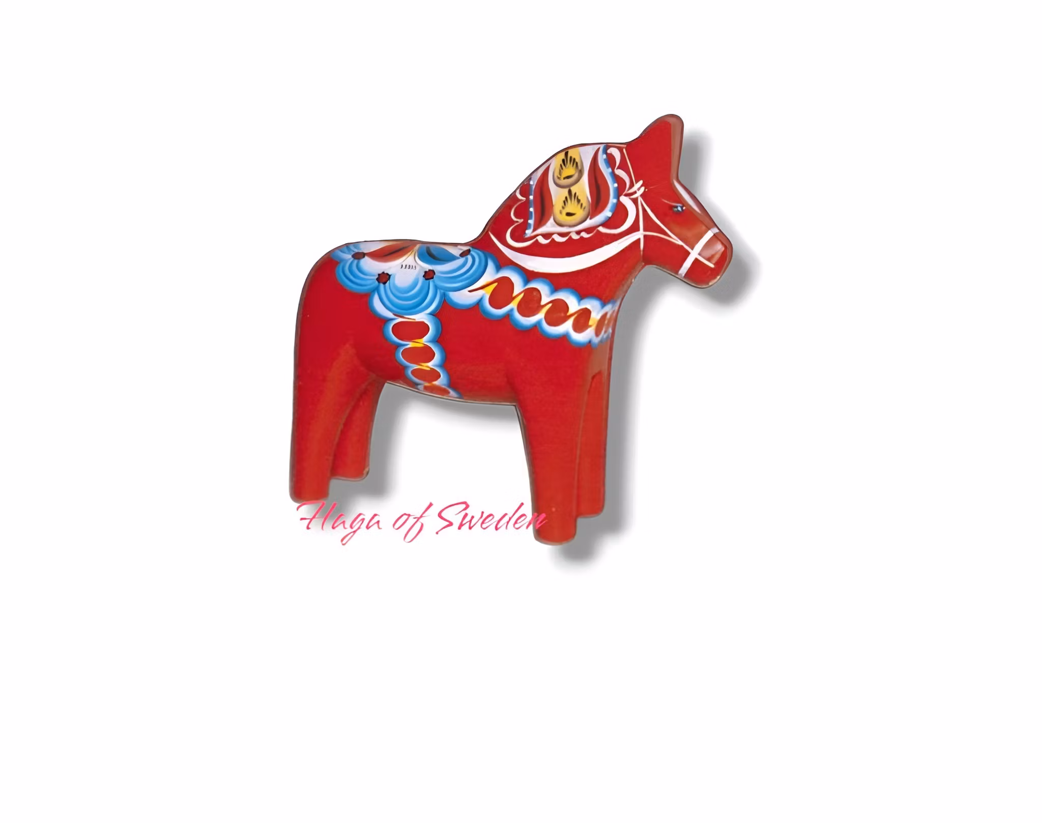 Platt magnet av trä med tryckt motiv.