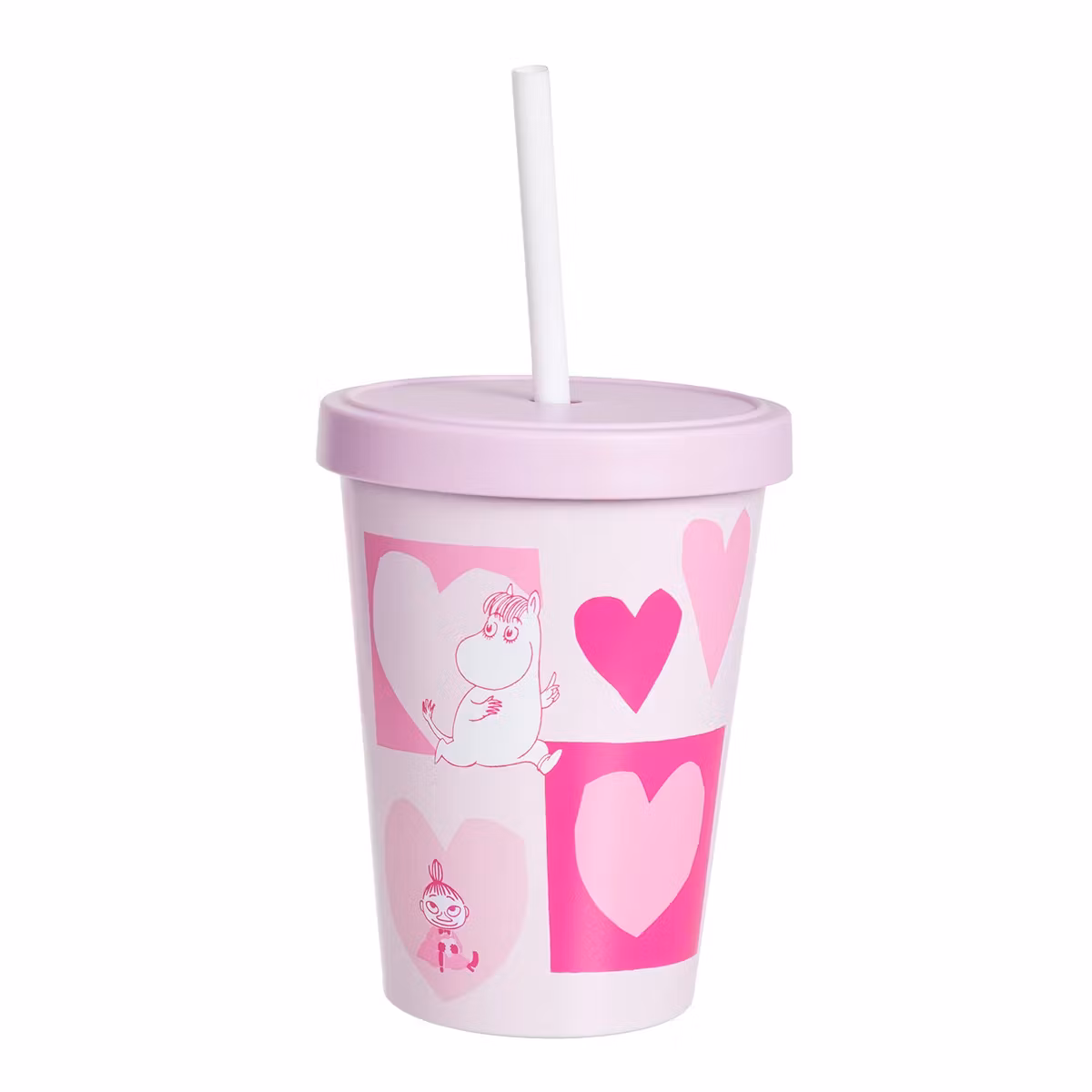 En söt, rosa sugrörsmugg med lock, tillverkad i återvunnen plast, med kärleksfullt moominmotiv. Tål maskindisk och även varma drycker (70°C). Muggen är inte helt tät kring sugröret. Sugröret har en liten ring i nedre änden för att förhindra att det faller ut. Produkten innehåller också en silikon ärm så att fingrarna inte kommer att brinna när drycken är riktigt varm.