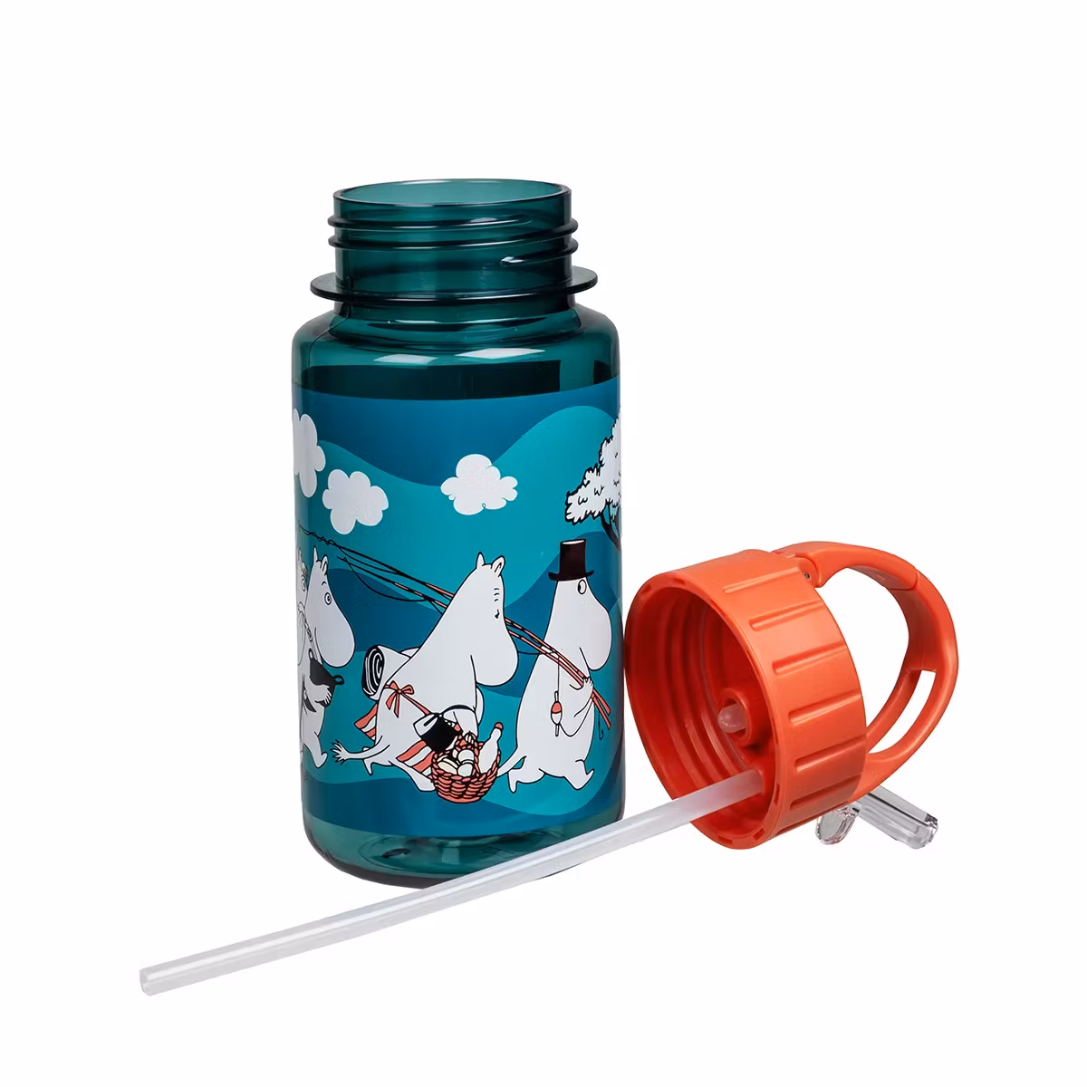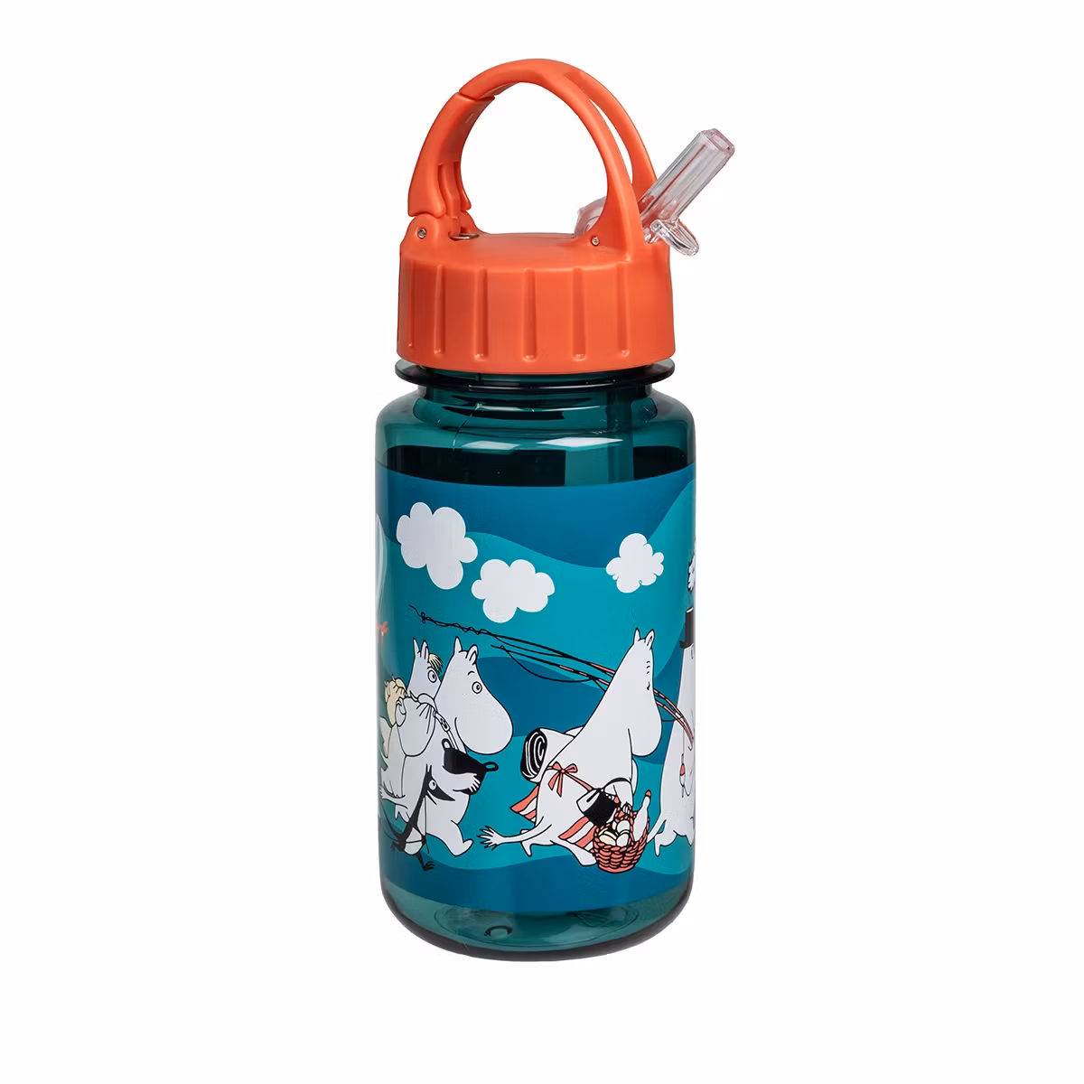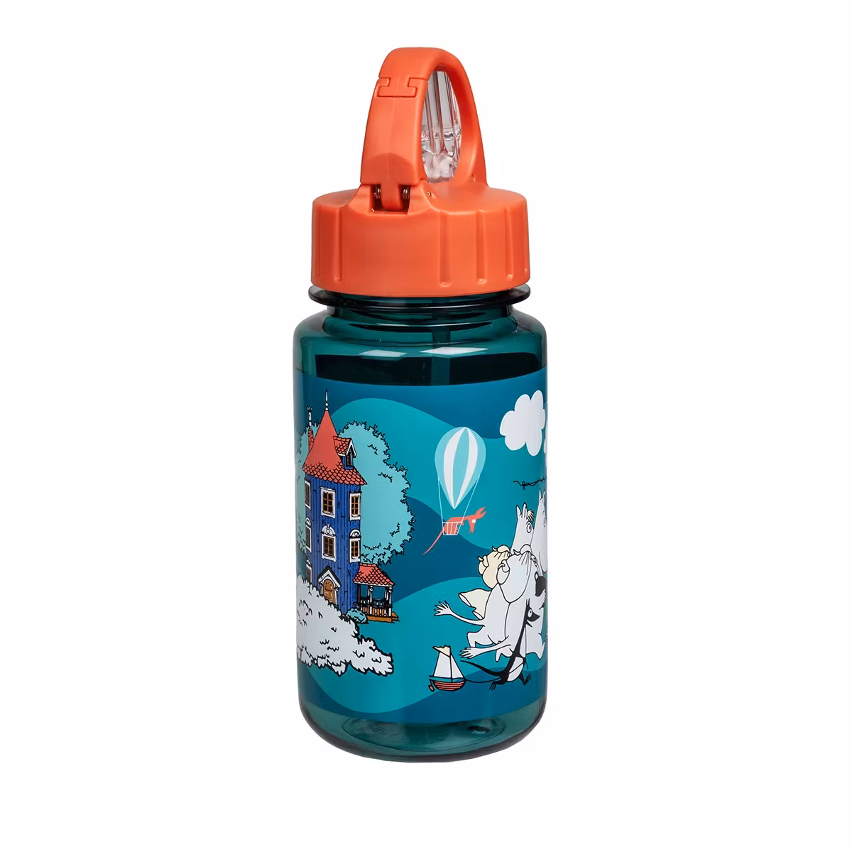 En vattenflaska med sugrör i barnstorlek. På trycket ser man Moominfamiljen återvända hem till Moominhuset efter ett av sina äventyr. Tillverkad i BPA-fri och hållbar tritan-plast. Det praktiska locket är utrustat med handtag, uppfällbar sugpip och snabblås för att lätt kunna hängas i till exempel väskan. Flaskan rymmer 3,5 dl.