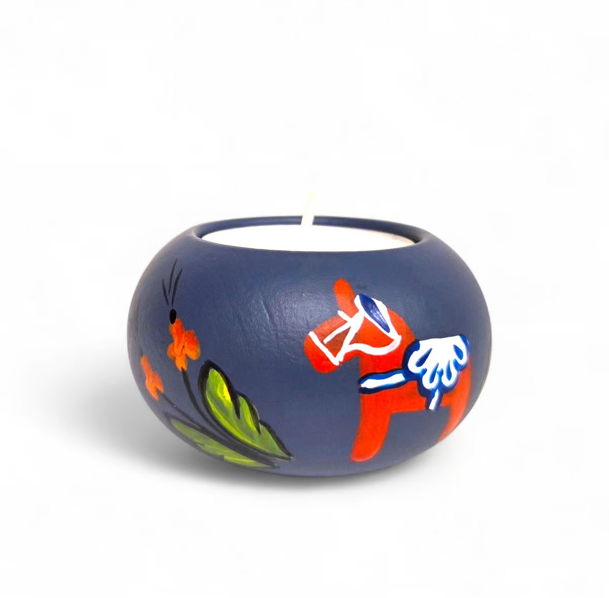 Handmålad ljusstake av trä för värmeljus. Levereras i present ask.